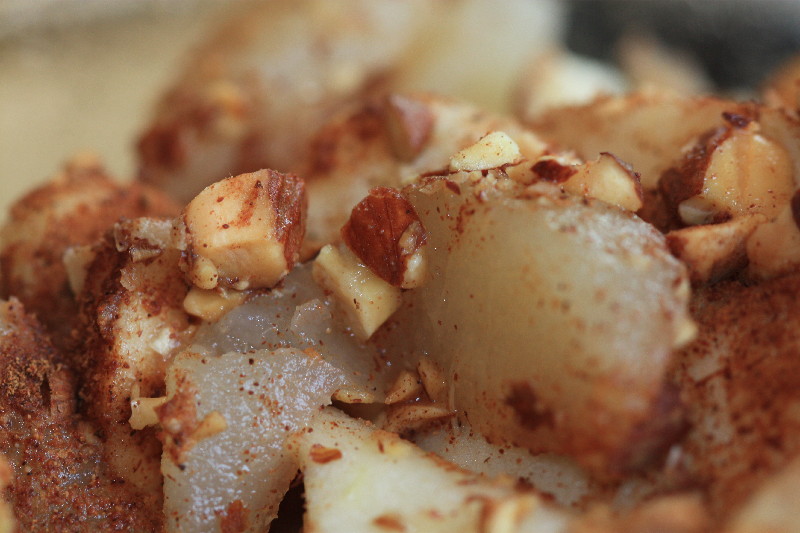 I made an old-fashioned skillet cake. Pears, apples, almonds, and spices are sauteed in butter and enveloped in a sweet batter, then baked until the batter puffs golden brown. This is similar to a dutch apple pancake. The real secret to this recipe is nutmeg, and lots of it. The kitchen smelled so good while this was baking!