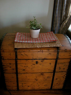 Starting last night, I spent hours and hours taking down my fall and winter things. My deep red plaids, my carefully pressed and framed leaves, my decorative gourds, my little dishes of acorns...all gone. Even the poinsettias got the axe. I put my spring-themed fabrics on the couches and bookshelves. I lined up all remaining houseplants on the window seat to create a soothing green space. Mostly, since this is a work in progress, I'm trying to create small "spring spaces" that will spread as I continue to work on this project...especially after the garden centers open up!Here's an example of a small, simple green space I created next to the couch: