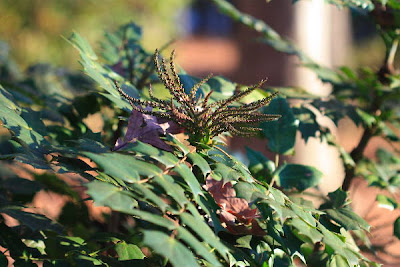 In the winter, these spikes bloom with yellow flowers and smell pleasant. I'll evaluate them this winter, but I will probably end up cutting them down. They can grow to be 12 feet tall and reseed readily. Besides, they look awfully...tropical. I'd rather choose a different type of shrub. We've already got the tropical japonica on either side of the front door, with its large, shiny leaves...